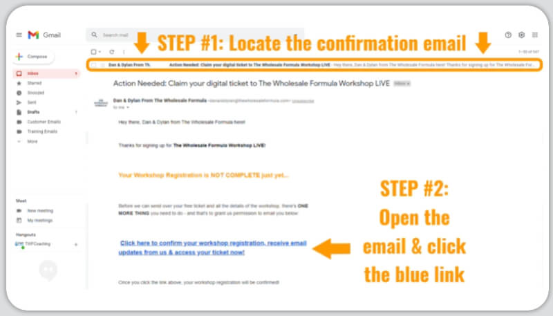 Once you find the email, open it and click the blue ink that says "Click here to confirm your masterclass registration, receive email updates from us & access your ticket now!"
